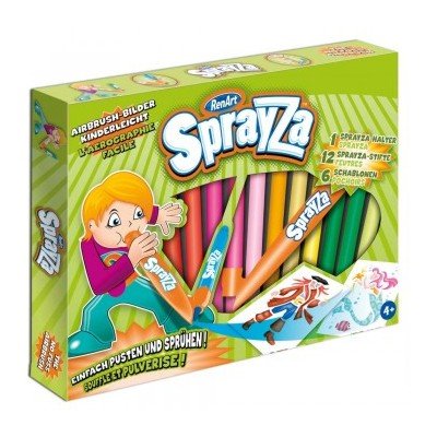 SprayZa - die neue Generation der Airbrush Stifte. Airbrush-Bilder kinderleicht, unter diesem Motto stehen die SprayZa Stifte aus dem Hause RenArt. Bei diesen modernen Airbrush Stiften hat jeder sein eigenes Mundstück und dadurch wird das Pusten mit diesen Stiften deutlich hygienischer. Das SprayZa Pro Set enthält: 1 SprayZa Mundstück, 12 SprayZa Airbursh Stifte, 6 Schablonen A5