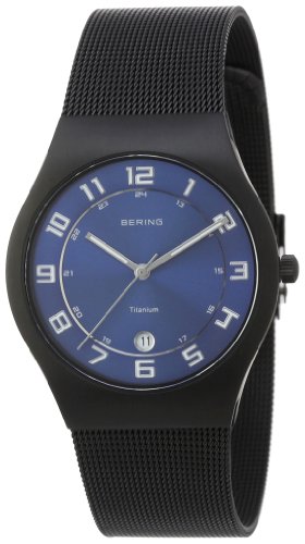 flaches, schwarz beschichtetes Gehäuse aus Titan, kratzfestes Saphirglas, wasserdicht bis 5 bar, Durchmesser 37 mm, Höhe 7 mm, schwarz plattiertes Milanaisearmband, Clip-Schließe, Quarzwerk mit Batterie, Datum, blau strahlendes Zifferblatt, Zeiger poliert, Leuchtzeiger und Zahlen, zentraler Sekundenzeiger, Gewicht 60 g, Bandbreite 20 mm, in Bering Geschenkbox