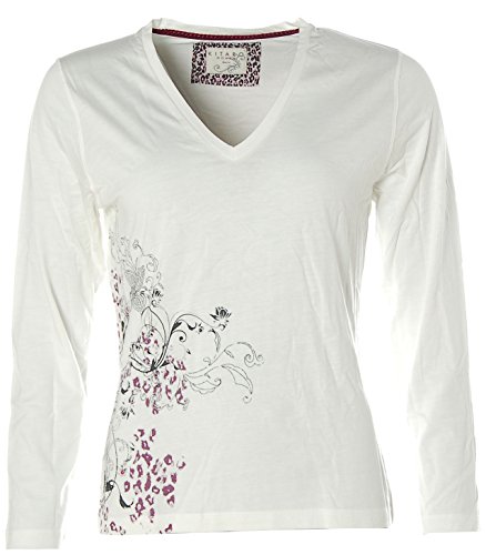 Edles V-Shirt der Kitaro Women Kollektion. Mit langen Armen, figurfreundlich geschnitten. V-Ausschnitt hinten innen mit Samtkragenband. Vorn unten rechts aufwendiger Print mit Blumenranken. Wundervoll feminin. Länge ca. 59 cm, einfache Achselbreite ca. 45 cm. Material: 50% Baumwolle, 50% Modal.