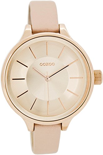 Die Uhrenmarke Oozoo hat sich in den letzten Jahren am Uhrenmarkt stark etabliert. Im Fashion Uhren Sortiment ist diese Marke nicht mehr wegzudenken. Oozoo zeichnet sich durch ein perfektes Preis-/Leistungsverhältnis aus. Hauptmerkmal der Oozoo Uhren sind große XXL Modelle. Mit bis zu 51 mm Durchmesser haben die Oozoo Uhren eine perfekte Größe für Freunde großer Uhren. Die meisten Uhren sind mit Echtlederbändern ausgestattet, man findet aber auch manche Modelle mit Silikon-, Textil- oder Metallbändern. Die bewährten Miyota Uhrwerke bilden das Herz jeder Oozoo Uhr. Artikelbeschreibung : - Gehäusedurchmesser : XL ca. 41 mm (ohne Krone) - Gehäusehöhe : ca. 11 mm - Metallgehäuse rosegold beschichtet glanz - Anzeige : Rosegoldene Stunde, Minute und Sekunde zentral - Hell pinkgraues Ziffernblatt mit rosegoldenen Indexen - Gewölbtes Mineralglas - Gerändelte Krone - Spritzwassergeschützt (2 Bar Prüfdruck nach DIN-Norm 8310) - Hochwertiges Miyota Quarzwerk - Pinkgraues Lederband mit Dornschliesse und 2 Bandschlaufen - Bandanstoss : 12 mm - Armumfang : von ca. 17.0 bis 21.0 cm - Gesamtlänge : ca. 24.0 cm Lieferumfang : - Oozoo Verpackung - Oozoo Garantiekarte