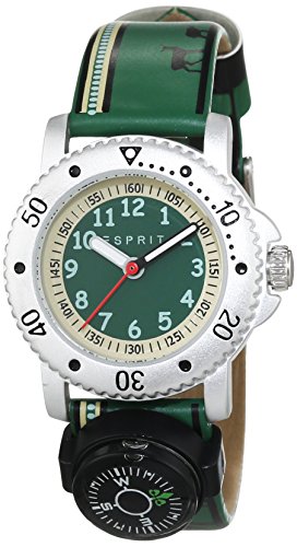 leichtes Aluminium-Gehäuse, Edelstahl-Gehäuseboden, Lünette mit Minutenskala, Mineralglas, wasserdicht geprüft bis 3 bar, Durchmesser 30 mm, Höhe 9 mm, bedrucktes Kunststoffband mit aufgedruckten Tier-Motiven, Lederfutter und Kompass, Dornschließe, 3-Zeiger-Quarzwerk, grünes Zifferblatt mit beigefarbenem Rand, leicht lesbare Zahlen, weiße Zeiger, inklusive Schlüsselanhänger mit Karabiner