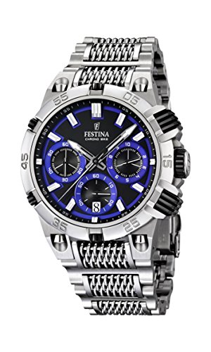 Bei der Festina Uhr gibt es für mich eigentlich nur eine Meinung: 5 Sterne! Man muss die Uhr in jedem Fall live in einem Geschäft gesehen haben. Wenn man auf große und stylische Uhren steht, sollte die Festina einen in der Regel sofort ansprechen.Ich habe beim Kauf einer neuen Uhr zwischen einer Diesel DZ4329 und der hier besagten Festina Uhr geschwankt. Ich habe mir beide Uhren in einer großen und bekannten Juwelierkette live angeschaut. Während ich bei Amazon nur anhand von Bildern und Bewertungen unsicher war, habe ich mich dann sofort für die Festina Uhr entschieden. Das Display der Uhr ist wunderschön, das Armband fast noch schöner (ziehe sowieso häufiger gerne Edelstahl Armbänder von z.B Diesel an) und das komplette Design rundet das ganze Paket ab. Auch meine Freundin meinte sofort die Festina Uhr ist es. Sie wirkte vor allem lebhafter als die Diesel Uhr (nichts gegen Diesel. Mag die Marke und habe auch viele Sache von denen über Ketten bis Armbänder). Die Verkäuferin meinte zudem, dass das Uhrwerk der Festina Uhr(en) besser und genauer ist als ggü. Diesel. Festina hat ein Schweizer Uhrwerk, Diesel eins aus Österreich. Ich kann dazu nichts sagen, verlasse mich da auf die Verkäuferin, eine Google Recherche bestätigte dies aber. Ich werde beobachten wie sich das Uhrwerk in Zukunft verhält.Das einzige "Problem" war dann für mich die Auswahl der Farbe, habe zwischen der blauen hier und der roten Version geschwankt. Leider konnte ich die rote nicht in live sehen, nur anhand Bilder. Hab mich aber für die blaue hier bei amazon entschieden und finde die wirklich sehr geil vom Design. Im Geschäft kostet die Uhr zur Zeit noch 300 Euro.Ich habe kein großes bzw dickes Handgelenk, eher ein mittelmäßig dickes. Musste die Uhr zwar kürzen für 9 Euro, aber passt dennoch dazu.Einen Kritikpunkt gibt es, aber deswegen von mir keinen Punkt bei der Bewertung weniger: Der Sekundenanzeiger für die Uhrzeit läuft im unteren Chronographen. Ist OK, hätte mir aber lieber der großen Sekundenzeiger in der Uhr dafür gewünscht (der ist nur für die Stoppuhr). Aber wenn ich auf die Uhr nach der Zeit schaue, sind mir die Sekunden relativ egal. Von daher ist es ok, hätte aber nichts dagegen, wenn es anders wäre. Dafür ist der große Sekundenzeiger ideal, wenn man die Stoppuhr verwendet. Braucht man nur Sekunden Werte, kann man diese besser ablesen als über den Chronographen. Allerdings verwende ich die Stoppuhr selten.Kann die Uhr definitiv weiterempfehlen! Ein schönes Stück und ein definitiver Hingucker!