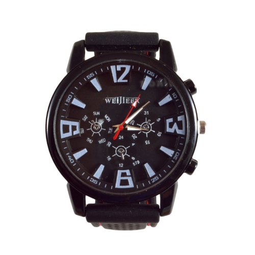 Hochwertige schwarze, sportliche und robuste unisex Quartz Uhr mit qualitäts Quartz Uhrwerk. Eine Uhr die es mit allen Uhren aufnehmen kann und das Silikon Gummi Armband lässt diese einfach stilvoll aussehen. Bitte beachten Sie, dass die drei zusätzlichen Displays auf der Uhr keine Funktion haben und nur Attrappen sind!